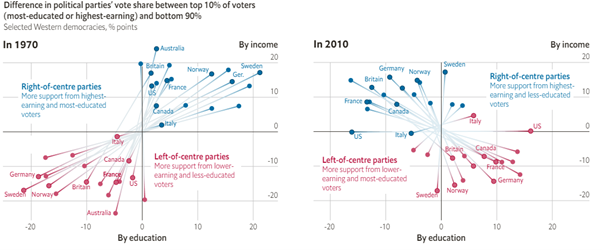 As the image shows, there has been a dramatic change in political thought across different sections of society over the 40-year period under examination. Broadly speaking in the period leading up to the 1970s data, the vote for left leaning parties, including those with a focus on democratic/social democratic or socialist underpinnings was associated with lower-educated, low-income segment of society. Whereas richer or more educated individuals voted for right leaning parties. Certainly, that was the stereotype that prevailed in my younger years, during the 70s and 80s.